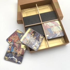 4 sous-verre et sa boite personnalisée - Polydorure sur images imprimées, papiers japonais et plaque plexiglass - 2024